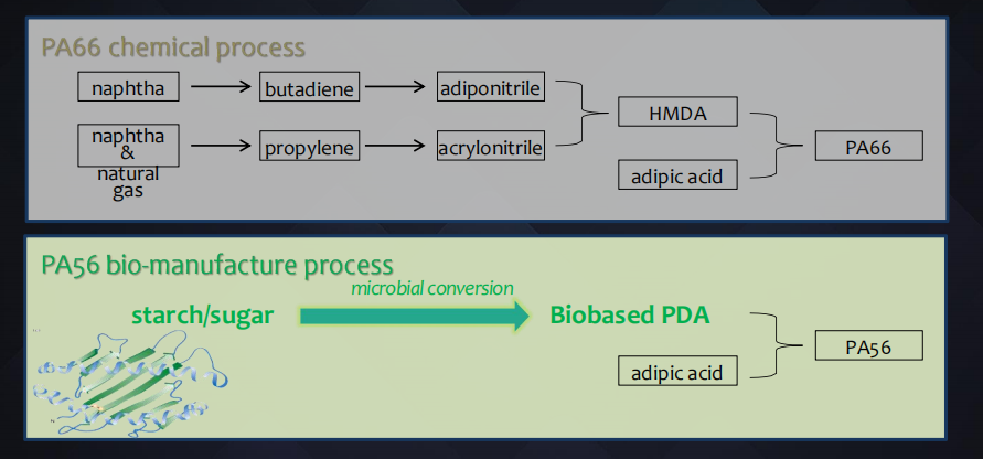PA56 products generates from biogenetic engineering, screening microbial strains, and through biofermentation to convert corn starch into the key raw material pentanediamine, and further synthesis of pentanediamine and adipic acid.